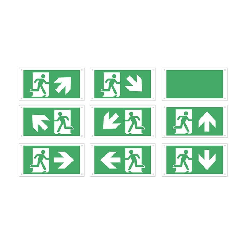 Inclusief complete set verwisselbare pictogrammen: links, rechts, boven, onder, beide diagonalen en een volledig groene inzet. Alle inserts zijn eenvoudig te verwisselen en worden meegeleverd in één verpakking.